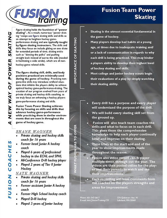 During the season, Fusion Training will provide an expert coach that specializes in power skating to attend multiple practes through the span of the hockey season. The expert coaches will run the set practices determined and will also train the coaches in our power skating techniques to foster growth and development between Fusion practices. The practices will be designed to fit the skill level of the team and each practice will build off of the last helping the team grow and evolve throughout the season.